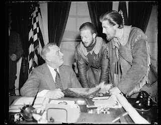 PRESIDENT MAY ATTEND NORTHWEST TERRITORY CELEBRATION AT MARIETTA, OHIO. WASHINGTON, D.C. MARCH 21. AFTER RECEIVING A WOODEN PLAQUE MADE FROM THE OAK THEY ARE USING TO BUILD FLAT-BOTTOMED BOATS SIMILAR TO THOSE IN WHICH THE PIONEERS FLOATED DOWN THE OHIO RIVER, PRESIDENT ROOSEVELT TODAY INDICATED HE WOULD ATTEND THE 150TH ANNIVERSARY CELEBRATION OF CREATION OF THE NORTHWEST TERRITORY AT MARIETTA, OHIO, SOMETIME NEXT JULY. DAVID PETERSON, CHICAGO IL, AND MONTE PARR, MINGO JUNCTION, OHIO, MEMBERS OF AN EXPEDITION REENACTING MARCH OF THE PIONEERS WHO BLAZED THE TRAILS INTO THE NORTHWEST TERRITORY, ARE SHOWN MAKING THE PRESENTATION